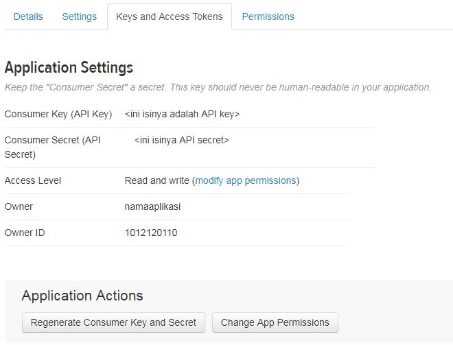 Terlebih dahulu, kita harus membuat sebuah Apps di Twitter Development atau dengan mengunjungi URL https://apps.twitter.com. Di Halaman ini silahkan buat sebuah apps dengan melengkapi seluruh informasi yang diminta oleh twitter. Kemudian setelah terbuat aplikasinya silahkan masuk ke Tab Key and Token Keys yang tampilannya seperti dibawah ini:
