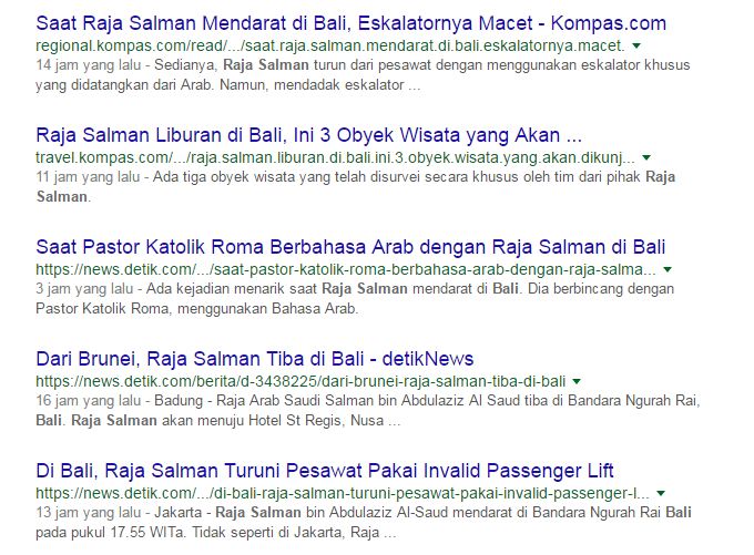 Dan yang terakhir ketika sudah masuk halaman detail dari sebuah berita, artikel ataupun konten, sebaiknya anda menghilangkan brand dan tagline di judul website anda, fokuslah pada judul dari blog atau artikel tadi. Sebagai contoh inilah hasil pencarian untuk keyword "Raja Salman di Bali"