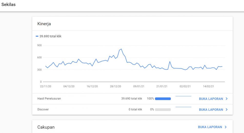 Pertama, kita akan mendapatkan gambaran singkat kinerja website kita, keyword mana yang paling sering tampil dan diklik, kita juga bisa menampilkan berdasarkan periode tertentu sebagai bahan evaluasi.